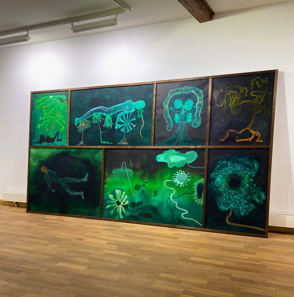 Dass dieser »Kosmos aus Erde und Wind und Himmel ein großer Körper ist, ein atmendes Wesen, in dessen Tiefe wir leben«, davon ist auch Gosia Machon überzeugt. In ihren Bildwelten unterscheidet sie nicht zwischen belebter und unbelebter Materie, menschlichen und nicht- menschlichen Lebewesen. Im Gegenteil, Machons Tuschezeichnungen sind bevölkert von Mischwesen aus Mensch, Tier und Pflanze. Grenzen verschwimmen, es gibt sie nicht mehr. Der Mensch geht in der Natur auf, wird eins mit ihr – und das ganz buchstäblich, wie etwa auf der siebenteiligen Bildinstallation zu sehen, die zu der großformatigen Arbeit »Psychy Paths« gehört. Gemalt in dunklen und in phosphoreszierenden Grüntönen lässt die Künstlerin hier Menschliches und Florales verschmelzen. Aus schemenhaften Körpern wachsen Pflanzen. Eine Menschengestalt liegt gebettet auf Blüten und Sprossausstülpungen. Eine baumartige Struktur, gleich einem Gesicht, blickt uns entgegen. Wurzeln, Flechten, rhizomorphe Gebilde, Samenstände, Blütenköpfe, Knospen und Triebe gehen in anthropomorphe Formen über. Gosia Machon, so lässt sich zusammenfassen, bringt Metamorphosen und Transformationen zur Darstellung: als Grenzüberschreitungen zwischen menschlicher Psyche und Natur, Körper und Umwelt.